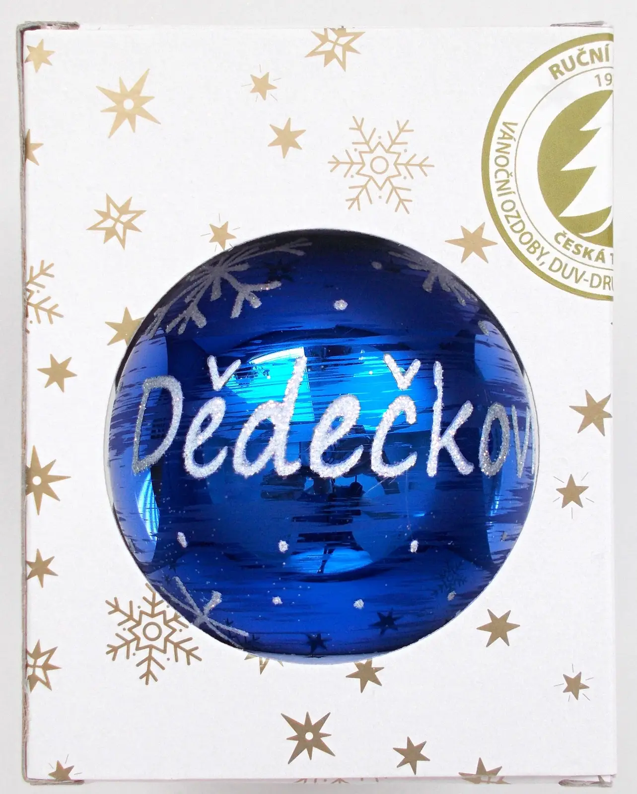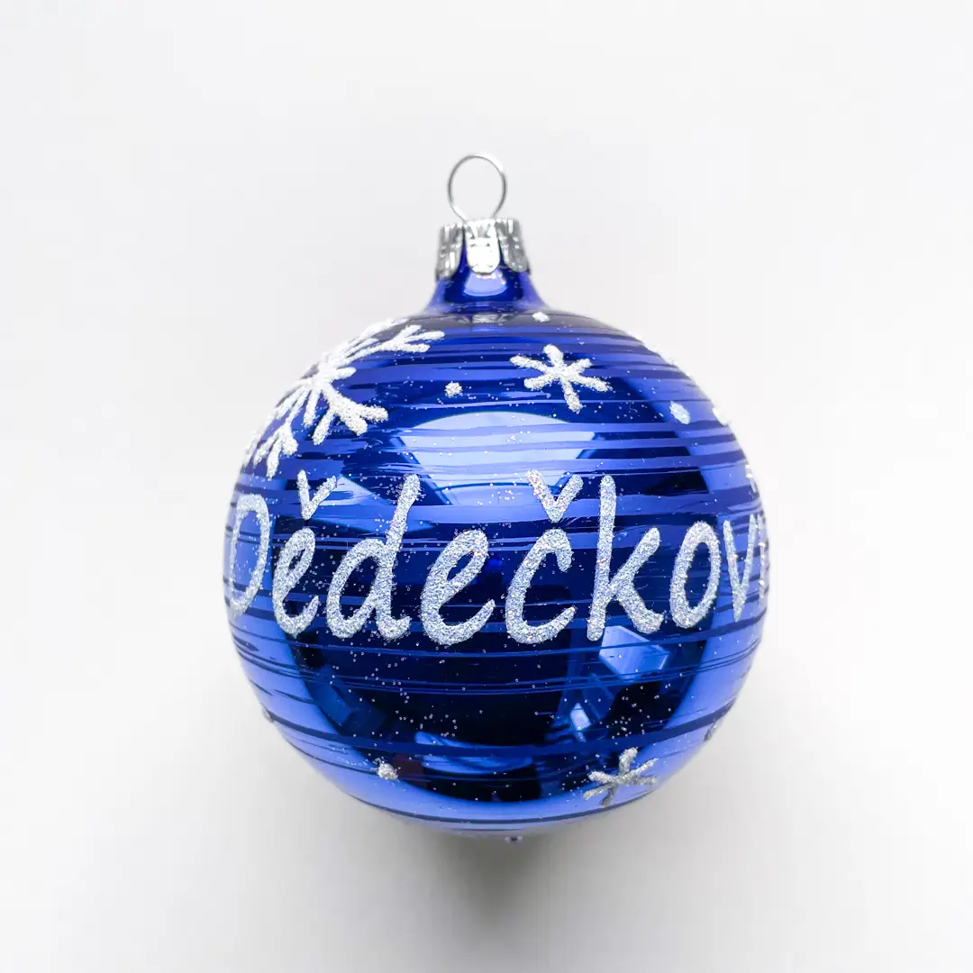 Tato skleněná koule v lesklé kobaltové barvě je doplněna nápisem „dědečkovi,“ což z ní činí ideální osobní dárek či doplněk do vaší vánoční výzdoby. Vyrobena tradičním způsobem ve Dvoře Králové nad Labem, její výrazná a zářivá barva v kombinaci s textem přináší do dekorace osobní a hřejivý prvek. S průměrem 80 mm a balením po 1 kuse je vhodná jako krásný výraz úcty a lásky v rámci vánočních svátků.