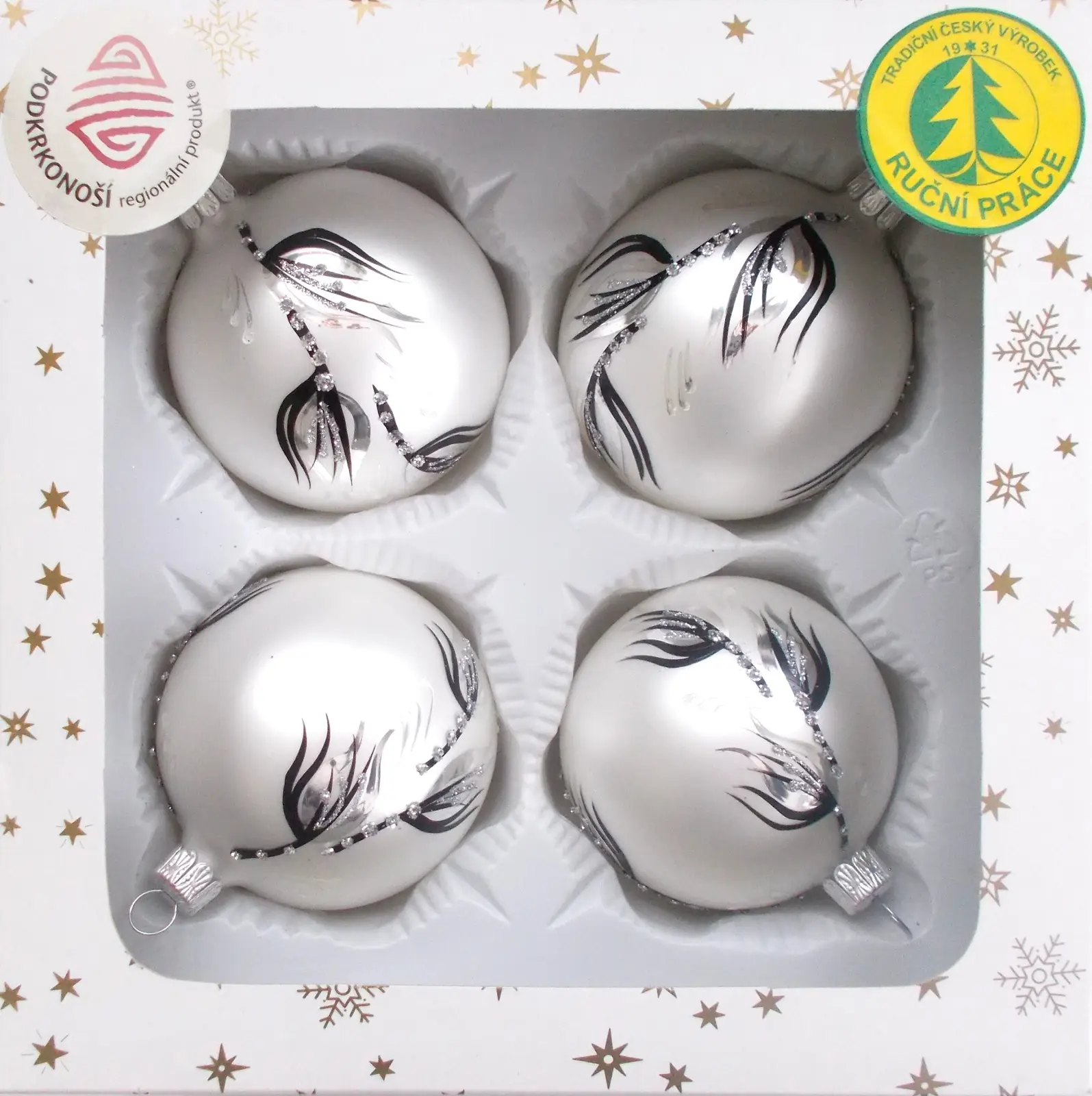 Tato skleněná koule v bílém matném provedení je ozdobena elegantními tmavými liniemi, které dodávají vaší vánoční výzdobě moderní a stylový vzhled. Vyrobena pečlivě ve Dvoře Králové nad Labem, její kontrastní dekor a čistý design z ní činí ideální doplněk pro slavnostní atmosféru. S průměrem 70 mm a balením po 4 kusech je perfektní volbou pro harmonickou a elegantní výzdobu.