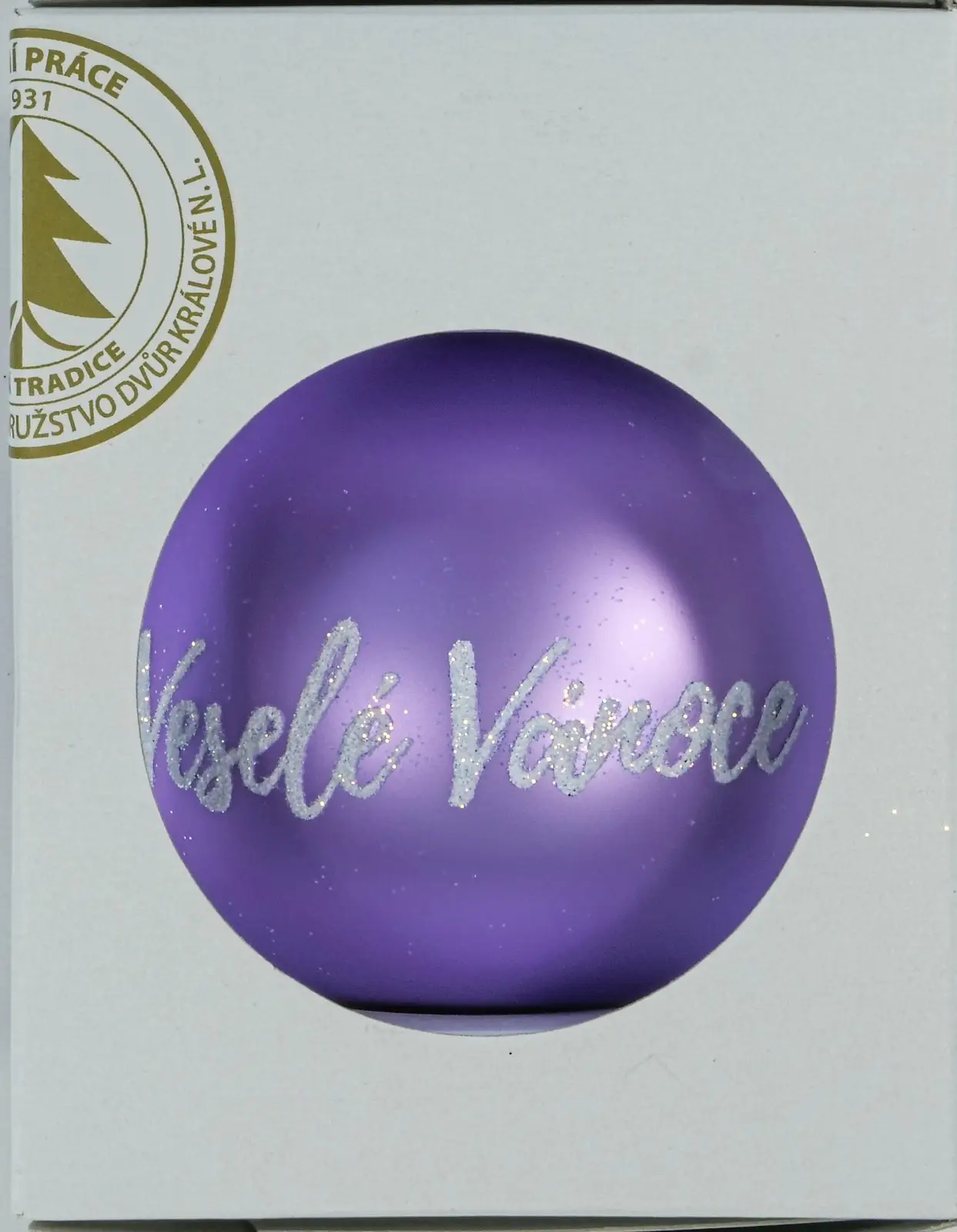 Tato skleněná koule ve světle fialové matné barvě je zdobena svátečním textem a zimním dekorem, který přináší vánoční výzdobě útulný a slavnostní vzhled. Vyrobena tradičně ve Dvoře Králové nad Labem, její jemné zpracování v kombinaci s elegantním odstínem zajišťuje stylovou a tematickou výzdobu. S průměrem 80 mm a balením po 1 kuse je ideálním doplňkem pro originální vánoční dekorace.